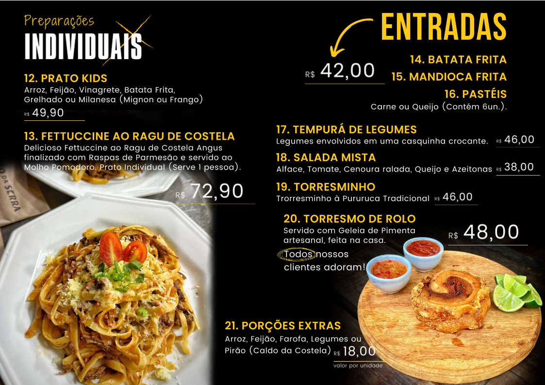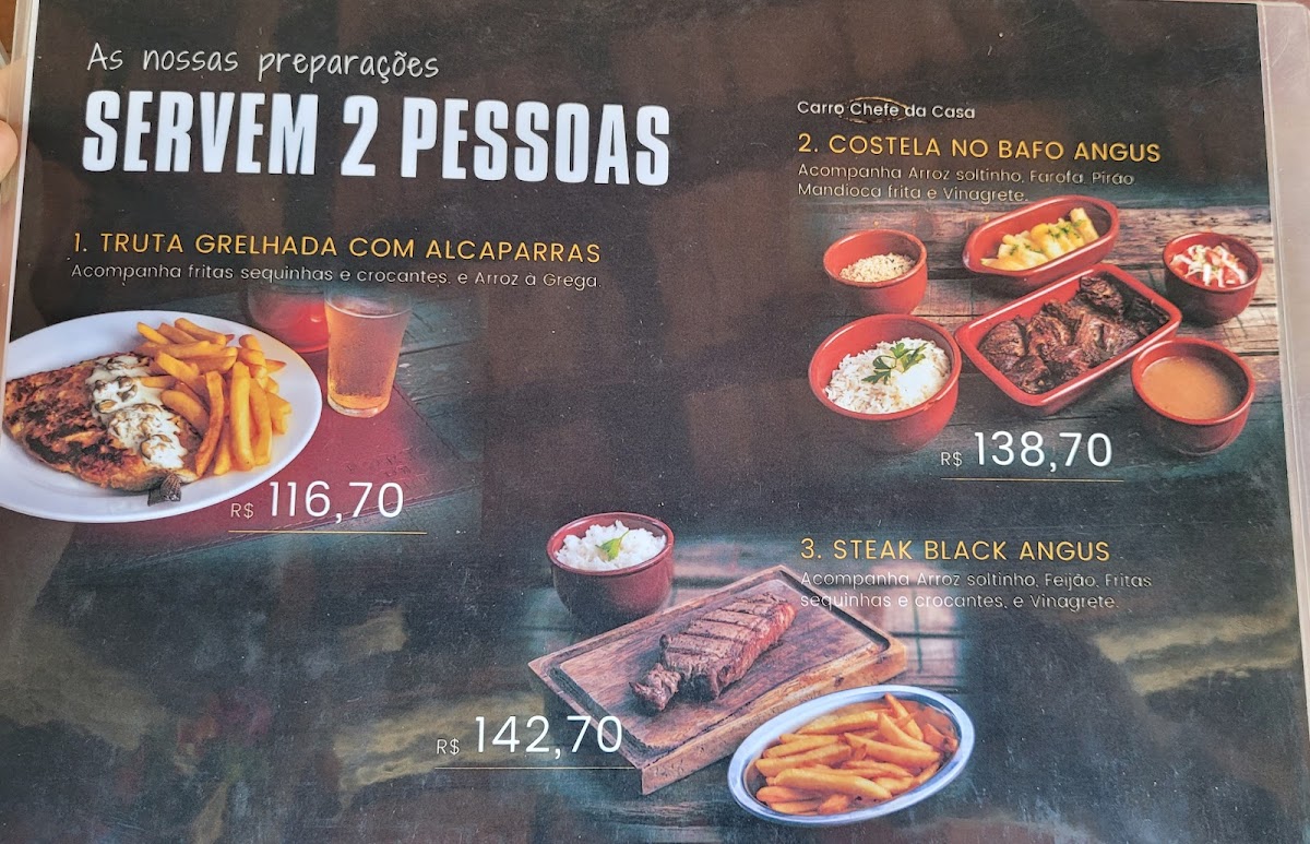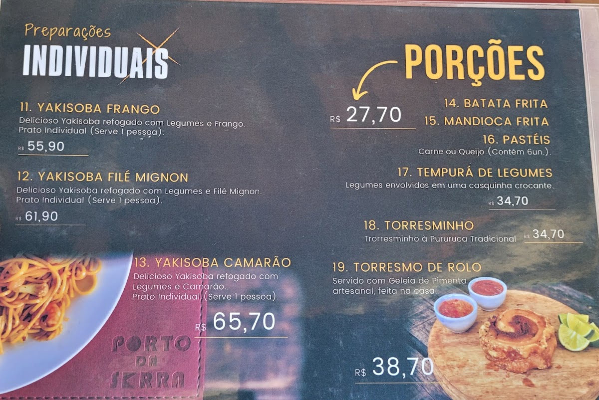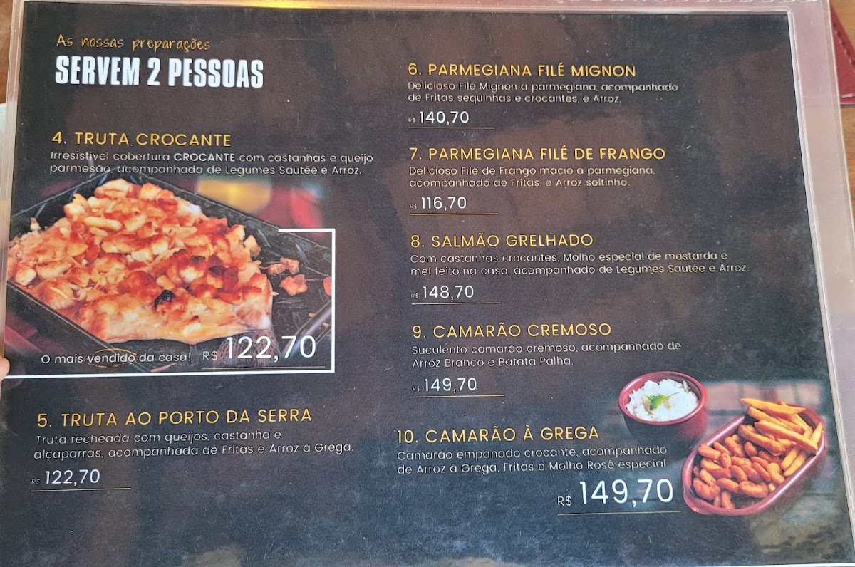 From a reviewer’s perspective, Porto Da Serra presents a menu that feels both comforting and distinctive, rooted in hearty regional flavors and lovingly prepared dishes. Central to the experience is the signature Costela no Bafo - a slow‑cooked rib that many diners return for again and again, anchoring the restaurant’s identity within its Churrascaria and À La Carte offerings. The menu also showcases trout in a couple of standout forms, with Truta Crocante crowned with cheese, nuts, and croutons and the elegant Truta ao Porto da Serra highlighting the fresh local ingredients and the kitchen’s finesse. Alongside these, creative and rustic plates like Meat Pizza and Torresmo de Rolo Cortado add variety, while traditional favorites like yakissoba and classic Filé de Frango à Milanesa (as seen in guest photos) suggest the breadth of choices available. Although specific prices aren’t widely published, the overall impression is of a menu that balances traditional countryside favorites with inventive touches, appealing to those seeking a relaxed Almoço or even a romantic meal in a natural setting.